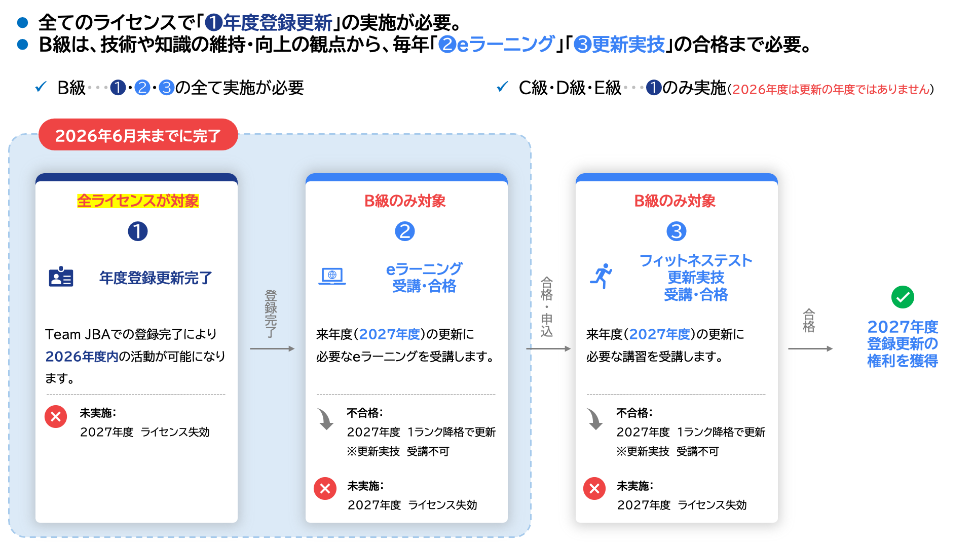 現在保有しているライセンスを有効化する手続きです。これにより、2026年度中の活動が可能になります。手続きは各自でTeam JBAにログインし、実施していただきます。