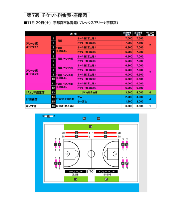 自由席のほか、コートサイド席・エンド席・車いす席が購入できます。